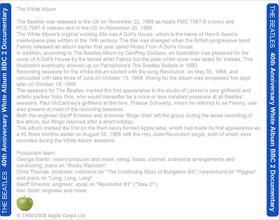 So The Beatles and Apple Corps failed to deliver the 40th anniversary new remastered edition of the White album in time. The tie-in promotional items were duly available from the official Beatles store, though (see separate entry). But the BBC delivered. As part of their Album season, they broadcast an hour long radio documentary on the album, where the producers, engineers and technicians who worked on the LP recalled their contributions.
